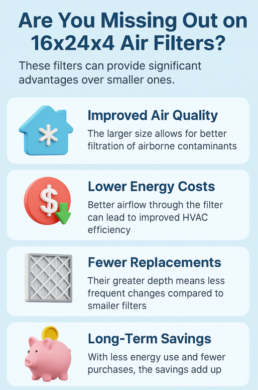 The 16x24x4 filter may not be flashy, but its benefits are real. For homeowners balancing health, comfort, and cost, it’s one of the smartest small upgrades with the biggest long-term payoff.